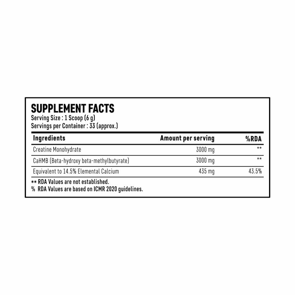 CaHMB (Beta-hydroxy beta-methylbutyrate) (3000mg per serving): Complementing Creatine, our HMB component takes center stage. Known for its ability to minimize muscle protein breakdown, HMB is the secret weapon for muscle preservation and growth. With 3000mg of CaHMB per serving, you’re investing in the most potent form for optimal results.